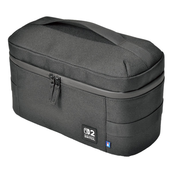 O interior comporta um console (Switch 2, Switch ou Switch OLED), dock do Switch 2 ou do Switch, adaptador AC, cabo HDMI, Joy-Con grips e pequenos itens extras. Os divisores destacáveis e ajustáveis permitem otimizar o espaço, mantendo tudo bem organizado e protegido contra impactos e arranhões.