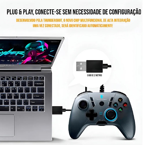 Compatível com computadores e smartphones, o Thunderobot G30 conecta-se facilmente via Bluetooth, garantindo uma jogabilidade fluida em diversas plataformas, incluindo Windows e Android. O controle vem com um cabo USB, facilitando o carregamento e a conexão quando necessário.